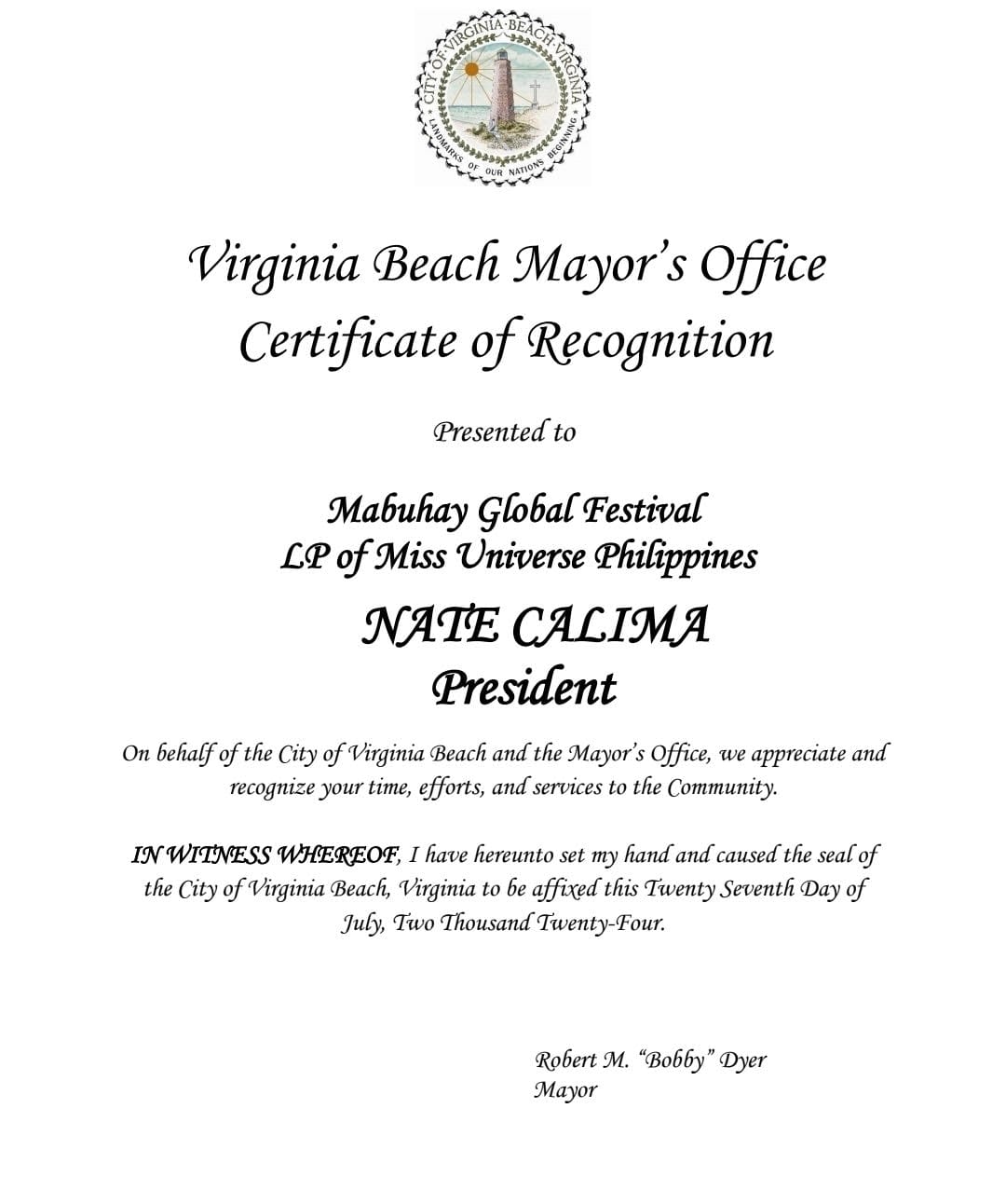 Nate Calima recognized by the city of Virginia Beach and Mayor Robert M. "Bobby" Dyer on July 27, 2024.